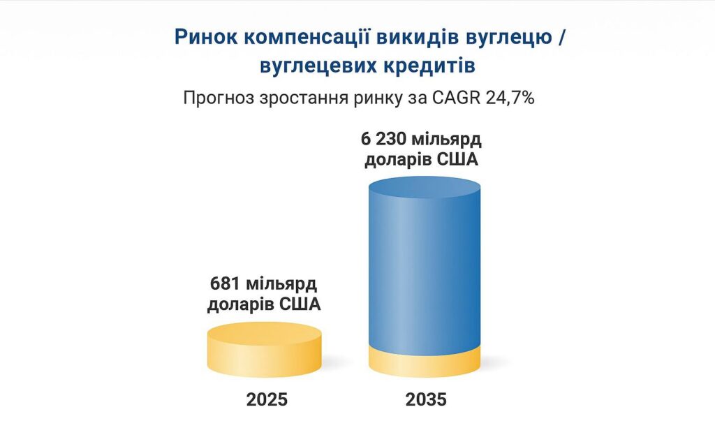 Глобальний ринок вуглецевих кредитів, зросте з 681 мільярда доларів США у поточному році до 6,23 трильйона доларів США до 2035 року, із середньорічним темпом зростання (CAGR) 24,7%.